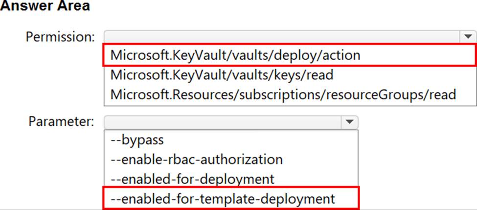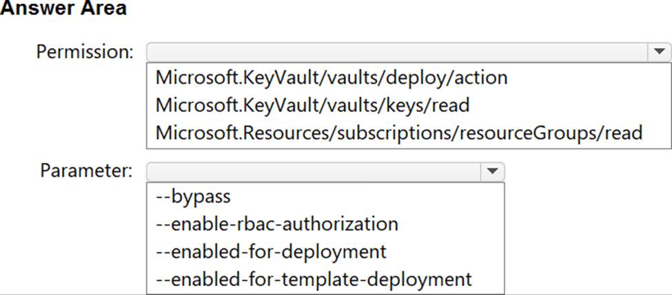 Which permission should you grant to User1, and which parameter should be specified when you create KV1? To answer, select the appropriate options in the answer area. NOTE: Each correct selection is worth one point.