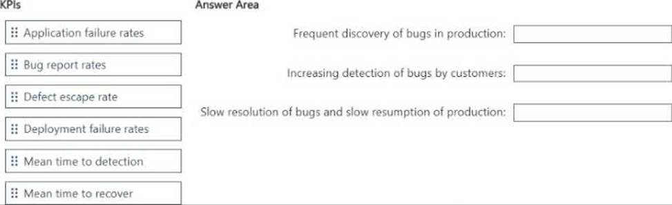 Which KPI should you implement for each issue? To answer, drag the appropriate KPIs to the correct issues. Each KPI may be used once, more than once, or not at all. You may need to drag the split bar between panes or scroll to view content. NOTE: Each correct selection is worth one point.