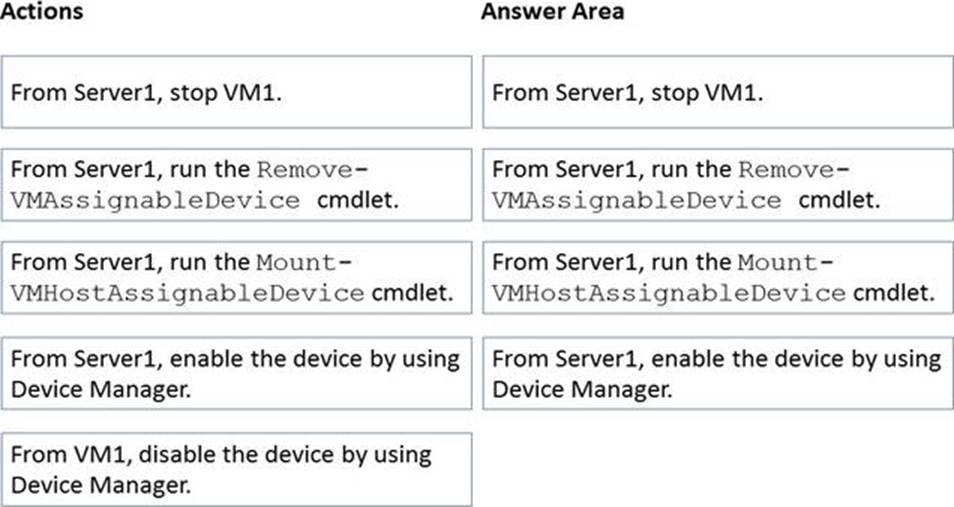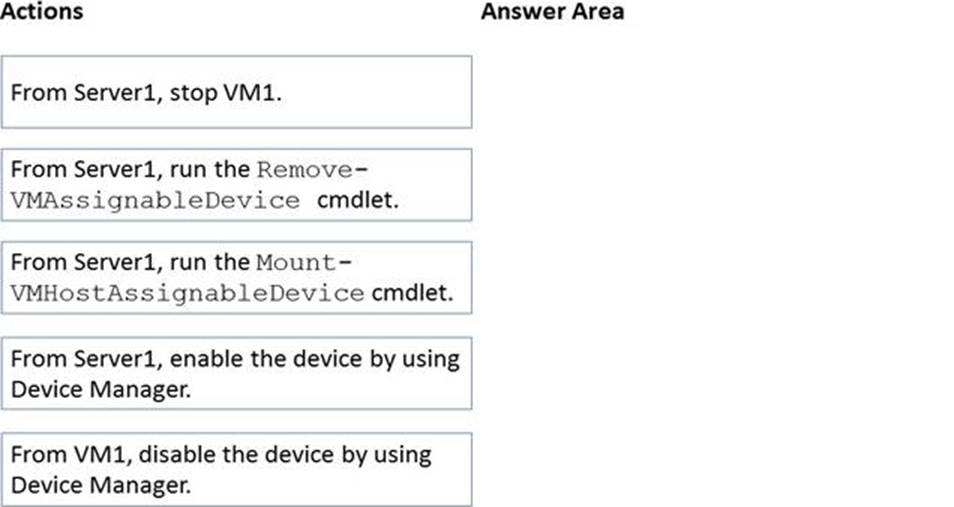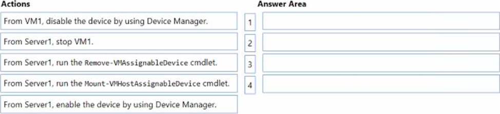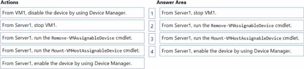 Server1 hosts a virtual machine named VM1. Server1 has an NV Me storage device that is assigned to VM1 by using Discrete Device Assignment.