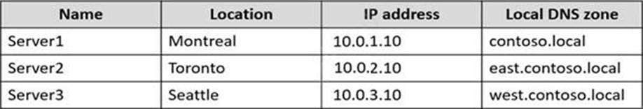 Solution: On Server2, you create a conditional forwarder for contoso.local and west.contoso.local. On Server3, you create a conditional forwarder for contoso.local and east.contoso.local.