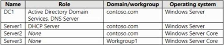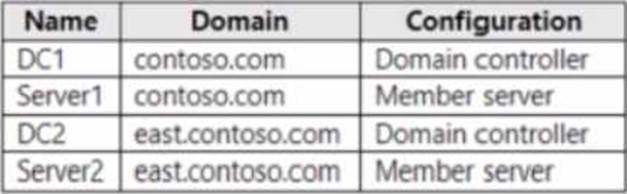 The forest contains two domains named contoso.com and east.contoso.com and the servers shown in the following table.