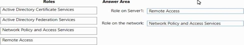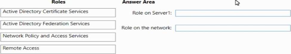 Which role should you add to Server1, and which role should you add to the network? To answer, drag the appropriate roles to the correct targets. Each role may be used once, more than once, or not at all. You may need to drag the split bar between panes or scroll to view content.