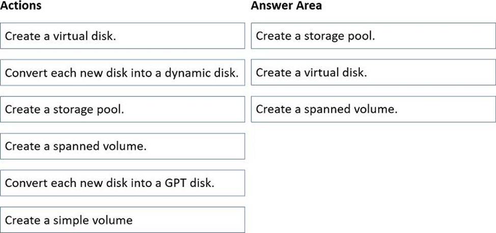 The Windows Server Storage Spaces guidance in Administering Windows Server Hybrid Core Infrastructure explains that expanding storage with heterogeneous media (HDD + SSD) is done by first aggregating physical disks into a storage pool, then carving that pool into one or more virtual disks that can use storage tiers. The materials state that a pool “abstracts a set of physical disks” and a virtual disk “exposes logical capacity and resiliency and can be configured with tiers such as an SSD performance tier and an HDD capacity tier,” allowing frequently accessed blocks to reside on SSD for faster read performance while colder data remains on HDD. After creating the virtual disk, you initialize it and create a volume (format with NTFS/ReFS) to make the capacity available to the OS. The study guide also notes that legacy dynamic/spanned volumes are not used with Storage Spaces, and converting disks to GPT is unnecessary for this scenario because the pool/virtual disk layer abstracts the underlying media. Therefore, the minimal, correct sequence to use all eight new disks and achieve the best read performance for hot data is: Create a storage pool → Create a (tiered) virtual disk → Create a simple volume.
