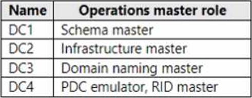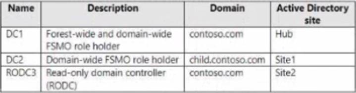 You have an Active Directory Domain Services (AD DS) domain that contains the domain controllers shown in the following table.