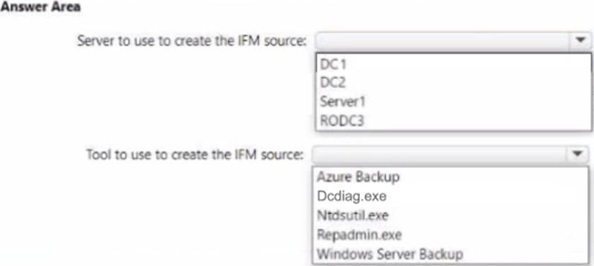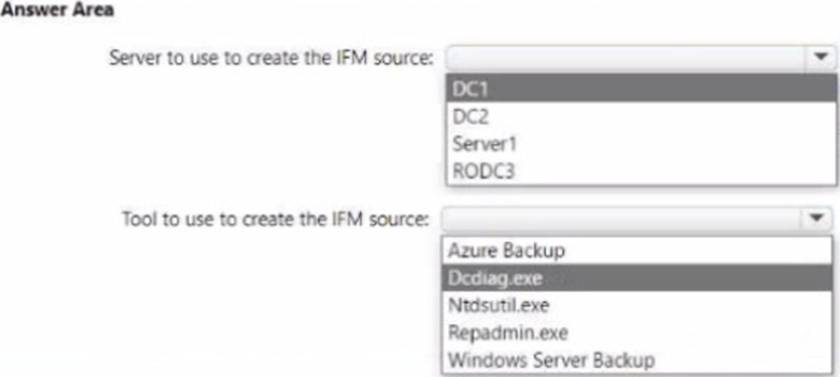 Applied here: the server to be promoted (Server1) will be an RODC in child.contoso.com. The only writable DC in that domain shown is DC2 (Domain-wide FSMO holder for child.contoso.com), making it the correct and traffic-efficient source. DC1 and RODC3 are in contoso.com (parent domain), so neither meets the requirement; additionally, an RODC cannot be used as an IFM source. Regarding tooling, the documentation notes that Windows Server Backup is for system-state backup/restore and is not the supported method to generate IFM media; the prescribed tool is Ntdsutil.exe with the IFM context. Therefore, to minimize network traffic and satisfy Azure/AD DS best practices, create the IFM media on DC2 using Ntdsutil.exe and then promote Server1 with that media.