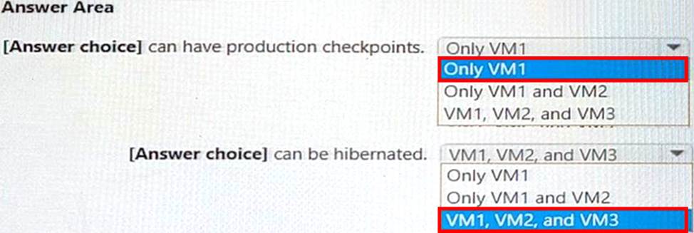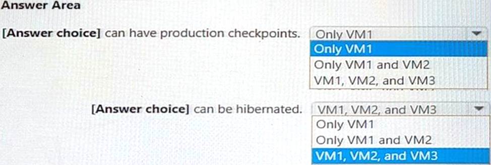 [Answer choice] can have production checkpoints. = VM1, VM2, and VM3 [Answer choice] can be hibernated. = Only VM1 and VM2