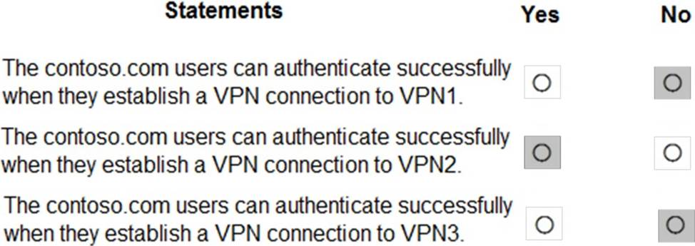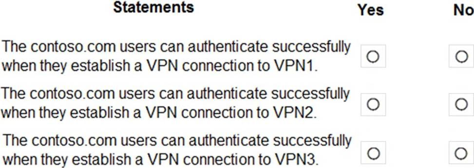 VPN1, VPN2, and VPN3 use NPS1 for RADIUS authentication. All the users in contoso.com are allowed to establish VPN connections.