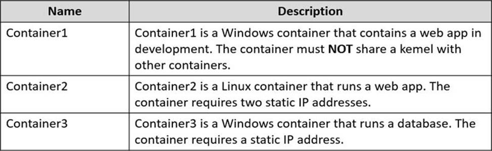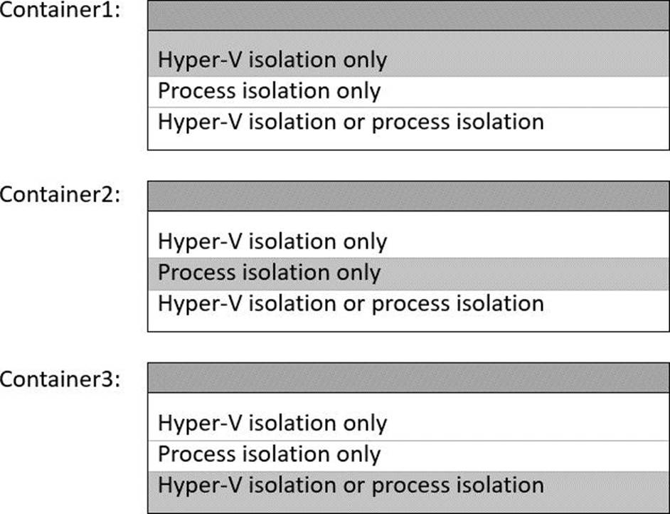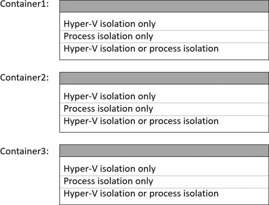 Which isolation mode can you use for each container? To answer, select the appropriate options in the answer area. NOTE: Each correct selection is worth one point.