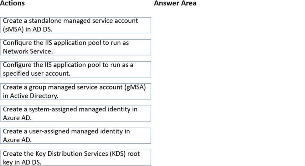 Mapping these requirements to the scenario: Webapp1 runs on WEB1 and WEB2 and must use the same service account with an automatic 30-day password change. Therefore, the correct sequence is: create the KDS root key, create the gMSA, and then set the IIS application pool to run under that account. This fulfills the security requirement while allowing both web servers to share the same, automatically-rotated credentials.