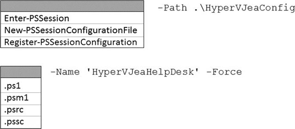 Critically, among the listed cmdlets, Register-PSSessionConfiguration is the one that accepts -Name and -Path to a .pssc file, which matches the prompt (-Path .hypervJeaConfig __ -Name ‘hypervJeaHelpDesk’ -Force). Enter-PSSession is for connecting to an already published endpoint, and New-PSSessionConfigurationFile creates the .pssc but does not publish it. Likewise, file types .ps1 (script), .psm1 (module), and .psrc (role capability) are not valid for the -Path parameter when registering an endpoint. Therefore, the correct completion is: Register-PSSessionConfiguration -Path .hypervJeaConfig.pssc -Name ‘hypervJeaHelpDesk’ -Force.