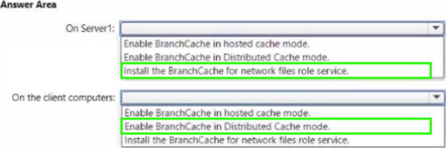 The Administering Windows Server Hybrid Core Infrastructure materials explain that BranchCache reduces WAN utilization by caching content that clients request from a remote content server. There are two modes: Hosted Cache and Distributed Cache. Hosted Cache “requires a server in the branch office configured as a hosted cache server,” while Distributed Cache “uses a peer-to-peer cache among Windows clients and does not require any servers in the branch.” For SMB shares, the content server (the file server at the main site) must have the “BranchCache for Network Files” role service installed so that it can advertise hashes and support BranchCache for file content. Client computers in the branch are then configured to Enable BranchCache in Distributed Cache mode so they can cache and retrieve content from each other, minimizing repeated downloads across the WAN.