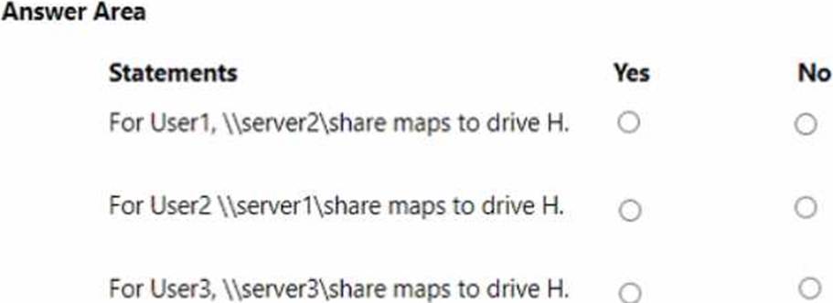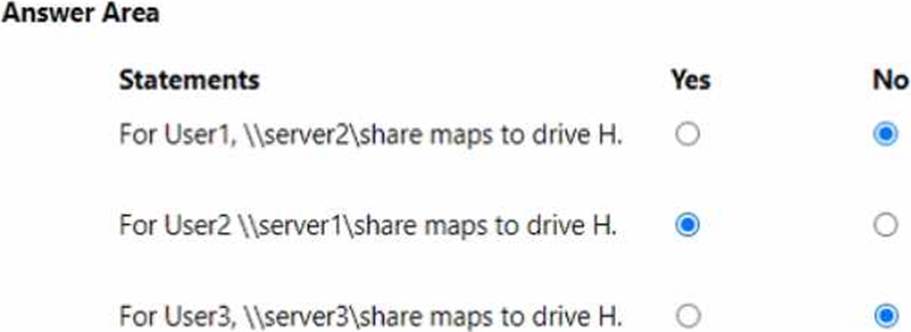 User1 (ContosoUsers) is not in OU1, so GPO2 (drive H to \server2share) does not apply. Only domain-level GPOs apply to the Users container; thus, the statement for \server2share is No.
