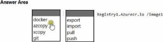 Applying this to the scenario: the registry login server is registry1.azurecr.io and the image is image1, so you would tag and then docker push registry1.azurecr.io/image1:latest (or another tag). The push command uploads the image layers to the remote registry so the image is stored in ACR. By contrast, docker pull retrieves images from a registry, export/import deal with container/filesystem archives, and tools like azcopy/xcopy/git are not used for publishing container images (azcopy/xcopy copy files/blobs; git manages source code, not OCI images). Therefore, the correct command pair for the hotspot is docker push to registry1.azurecr.io/image1.