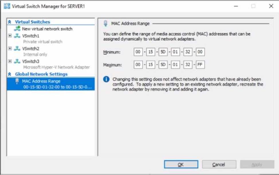 Server1 has a single network interface and the Hyper-V virtual switches shown in the following exhibit.