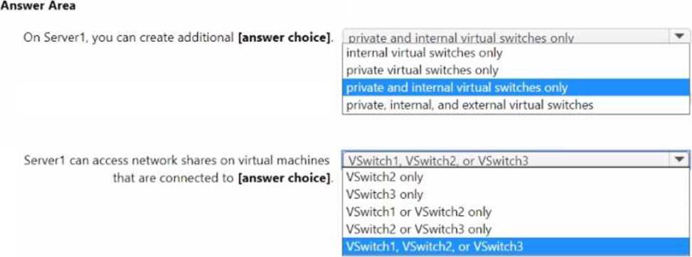 Regarding host connectivity, the guide specifies: “The management OS can communicate with VMs attached to an Internal switch and to an External switch (when the management OS is connected). The host cannot communicate with VMs on a Private switch.” Consequently, Server1 can access network shares only from VMs on vSwitch2 (Internal) or vSwitch3 (External with management OS), but not from VMs on vSwitch1 (Private).