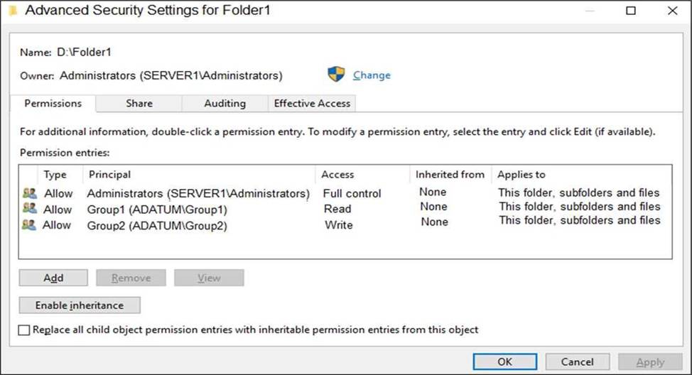 The advanced security settings for Folder1 are configured as shown in the Permissions exhibit. (Click the Permissions tab.)