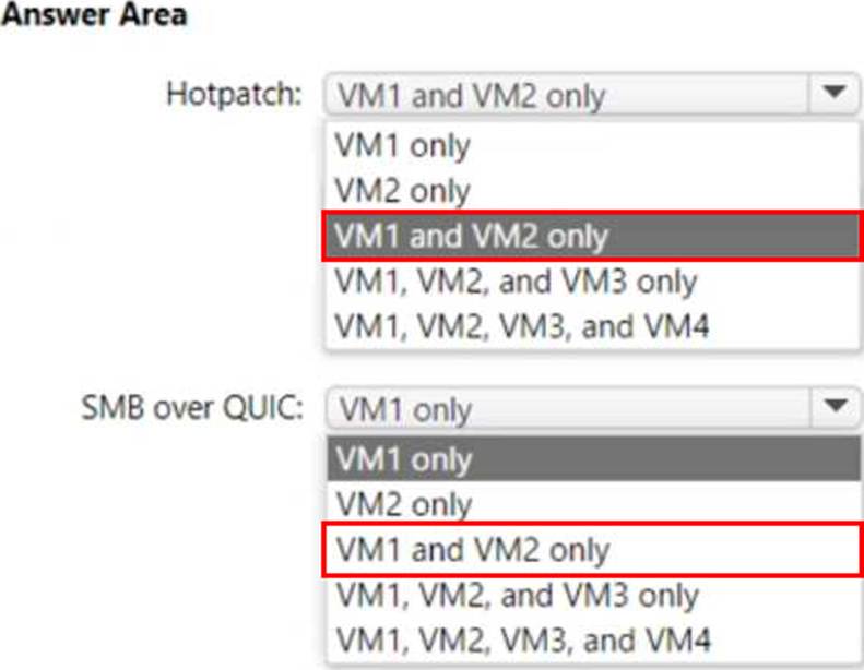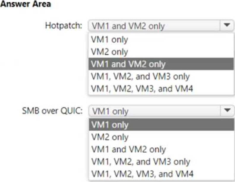 Thus, the correct selections are VM1 and VM2 only for both Hotpatch and SMB over QUIC.