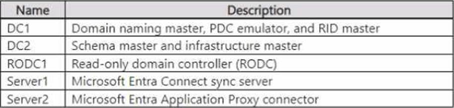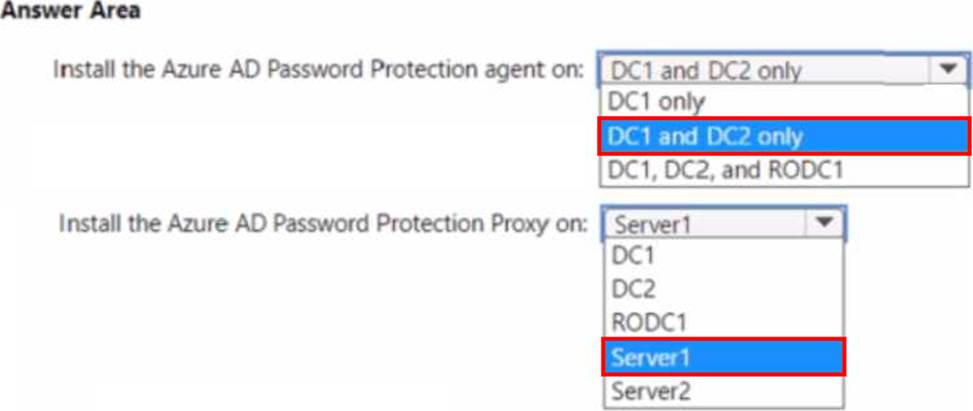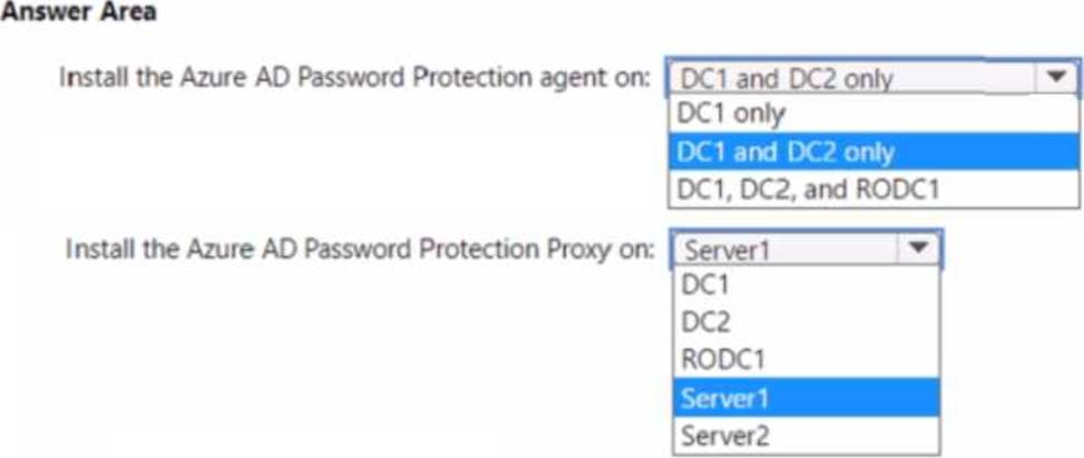 Applying these rules: install the agent on DC1 and DC2 (writable DCs) and not on RODC1. Place the proxy on an Internet-connected member server―Server2 (already an Application Proxy connector)― to meet enforcement, automatic updates, and minimal administrative effort.