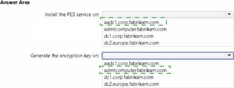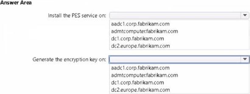 Where should you install the Password Export Server (PES) service, where should you generate the encryption key? To answer, select the appropriate options in the answer area. NOTE: Each correct selection is worth one point.