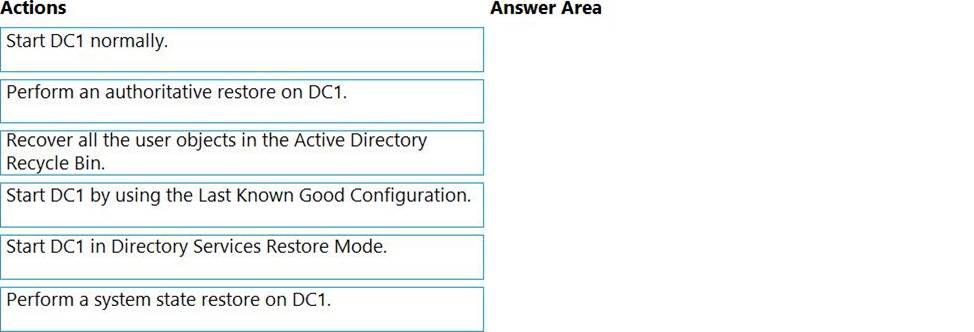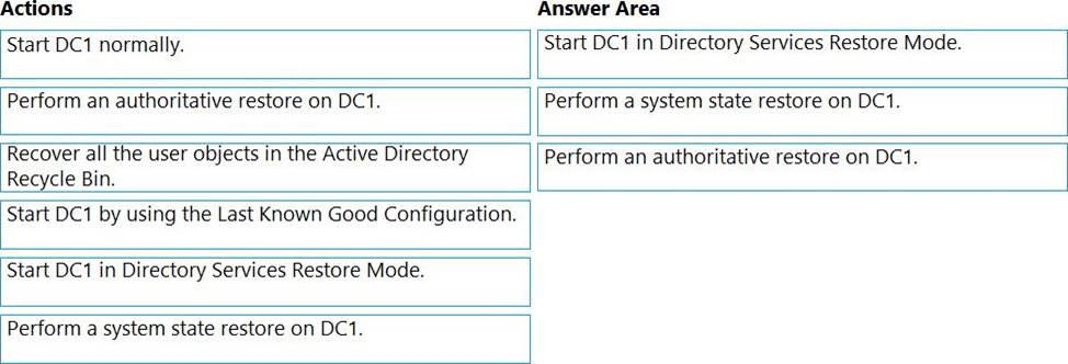 Your network contains an Active Directory Domain Services (AD DS) domain that has the Active Directory Recycle Bin enabled. The domain contains two domain controllers named DC1 and DC2. The system state of the domain controllers is backed up daily at 23:00 by using Windows Server Backup.