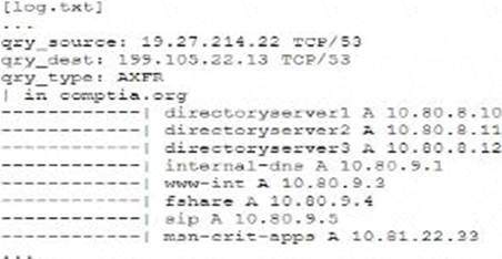 The log snippet indicates a DNS AXFR (zone transfer) request, which can be exploited by attackers to gather detailed information about an internal network’s infrastructure. Disabling DNS zone transfers is the best solution to mitigate this risk. Zone transfers should generally be restricted to authorized secondary DNS servers and not be publicly accessible, as they can reveal sensitive network information that facilitates lateral movement during an attack.