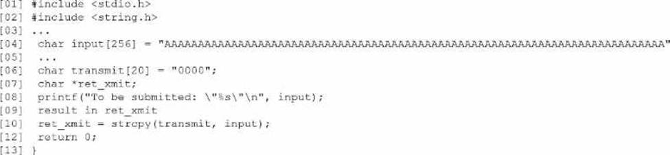 The vulnerability lies in line [10], where the function strcpy(transmit, input) is used. The strcpy function does not perform boundary checking when copying strings. Since input is defined with a size of 256 characters and transmit only has 20 characters allocated, the strcpy operation will cause a buffer overflow when the contents of input exceed the allocated size of transmit. This creates a significant security vulnerability, as attackers can overwrite adjacent memory, potentially injecting malicious code or altering program execution.