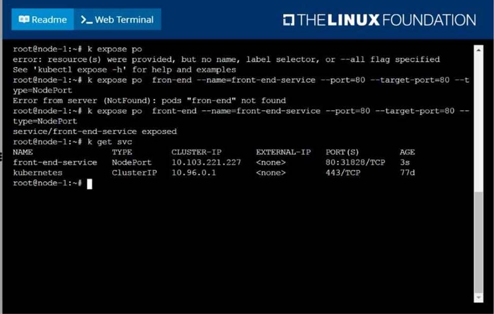 Create and configure the service front-end-service so it’s accessible through NodePort and routes to the existing pod named front-end.