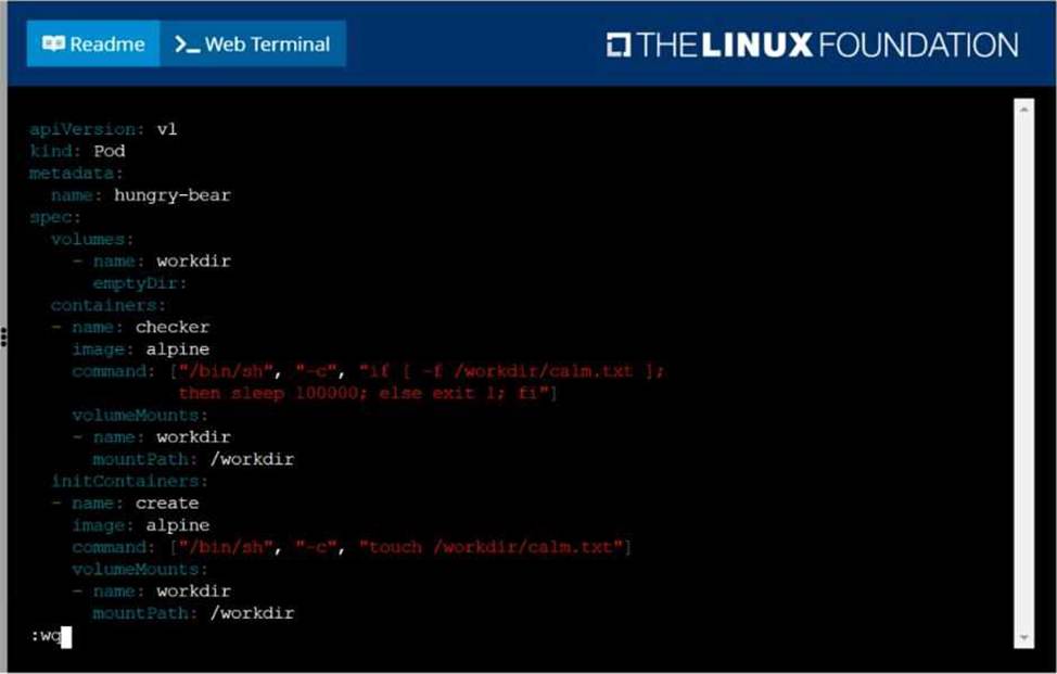The init container should create an empty file named/workdir/calm.txt If /workdir/calm.txt is not detected, the pod should exit