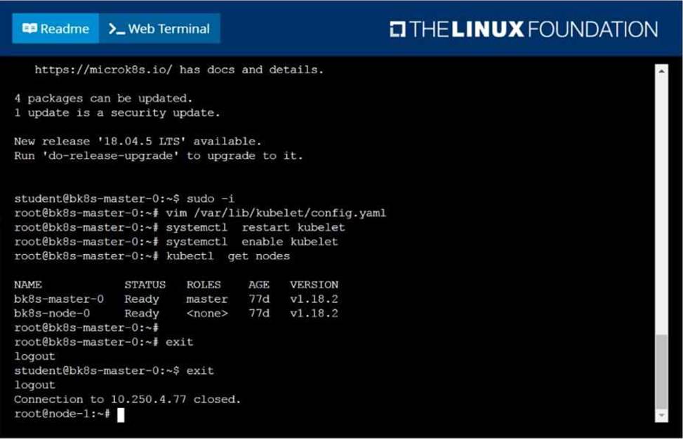 Given a partially-functioning Kubernetes cluster, identify symptoms of failure on the cluster. Determine the node, the failing service, and take actions to bring up the failed service and restore the health of the cluster. Ensure that any changes are made permanently. You can ssh to the relevant I nodes (bk8s-master-0 or bk8s-node-0) using:
