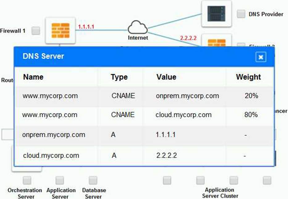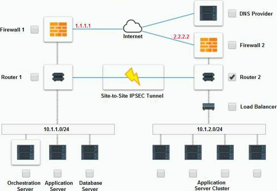 The other devices do not have any obvious errors in their configuration. The DNS provider has two CNAME records that point to the application servers in the cloud provider, with different weights to balance the load. The firewall rules allow the traffic from and to the application servers on port 80 and port 443, as well as the traffic from and to the VPN server on port 500 and port 4500. The orchestration server has a script that installs and configures the application servers in the cloud provider, using the DHCP server to assign IP addresses.