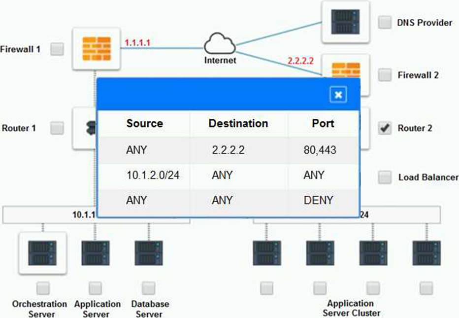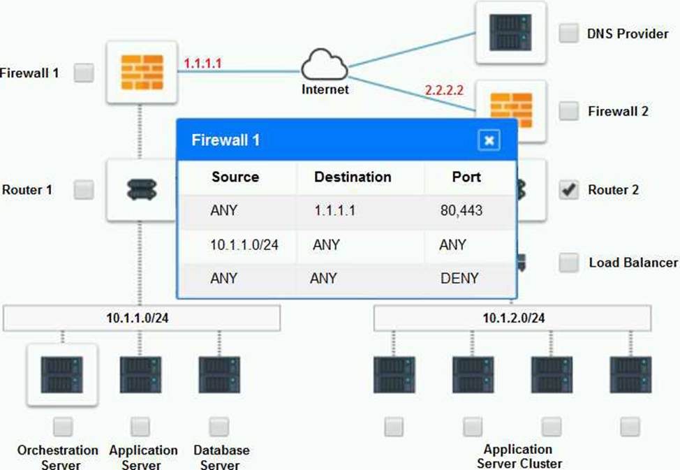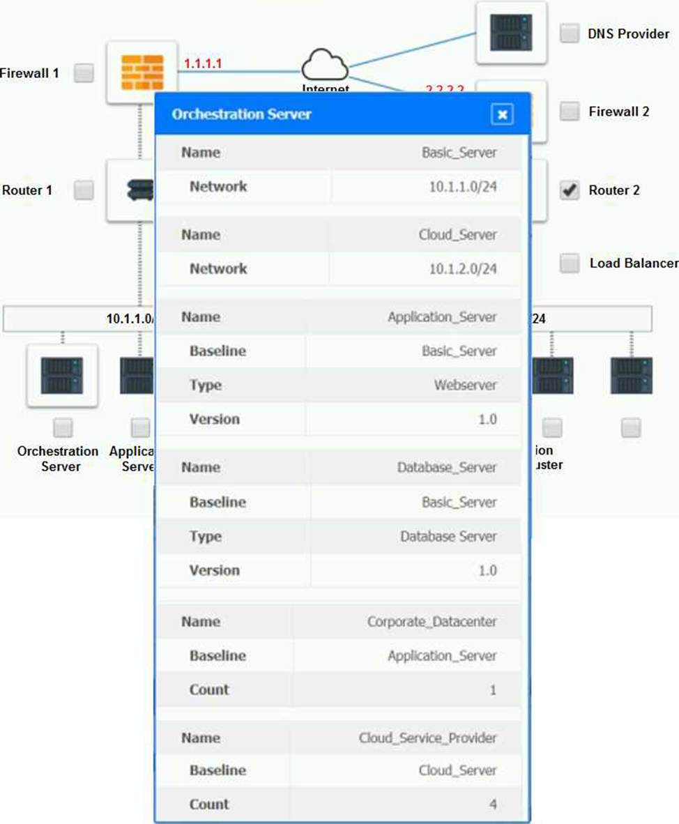 – Analyze the configuration of the following components: DNS, Firewall 1, Firewall 2, Router 1, Router 2, VPN and Orchestrator Server.
