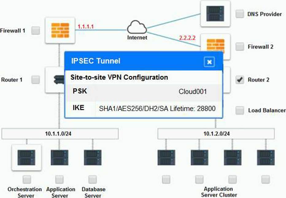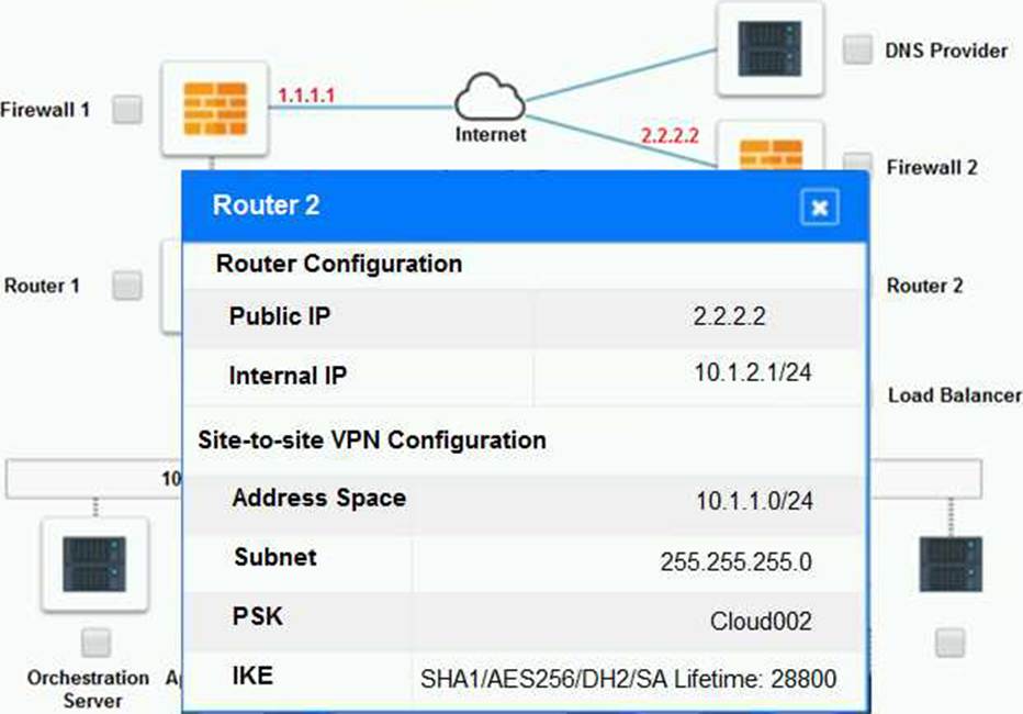The problematic device is Router 2, which has an incorrect configuration for the IPSec tunnel. The IPSec tunnel is a secure connection between the on-premises datacenter and the cloud provider, which allows the traffic to flow between the two networks. The IPSec tunnel requires both endpoints to have matching parameters, such as the IP addresses, the pre-shared key (PSK), the encryption and authentication algorithms, and the security associations (SAs).