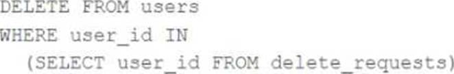 Assuming that user_id is a unique identifying key and that delete_requests contains all users that have requested deletion, which statement describes whether successfully executing the above logic guarantees that the records to be deleted are no longer accessible and why?