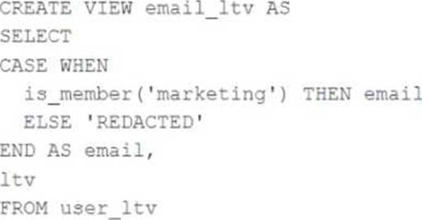 The code creates a view called email_ltv that selects the email and ltv columns from a table called user_ltv, which has the following schema: email STRING, age INT, ltv INT. The code also uses the CASE WHEN expression to replace the email values with the string “REDACTED” if the user is not a member of the marketing group. The user who executes the query is not a member of the marketing group, so they will only see the email and ltv columns, and the email column will contain the string “REDACTED” in each row.
