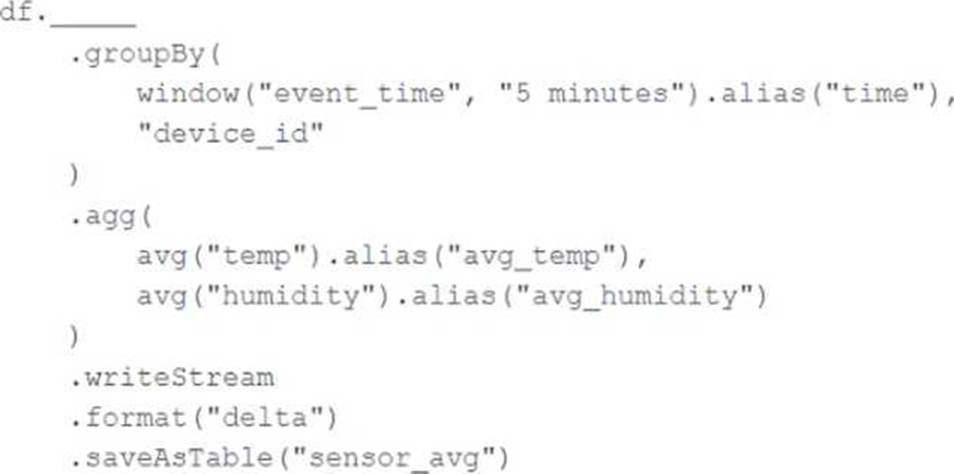 A junior data engineer has been asked to develop a streaming data pipeline with a grouped aggregation using DataFrame df. The pipeline needs to calculate the average humidity and average temperature for each non-overlapping five-minute interval. Incremental state information should be maintained for 10 minutes for late-arriving data.