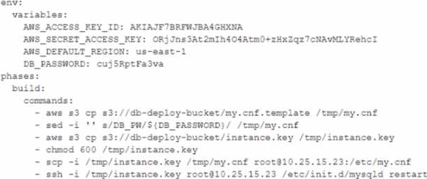 A DevOps engineer is working on a project that is hosted on Amazon Linux and has failed a security review. The DevOps manager has been asked to review the company buildspec. yaml die for an AWS