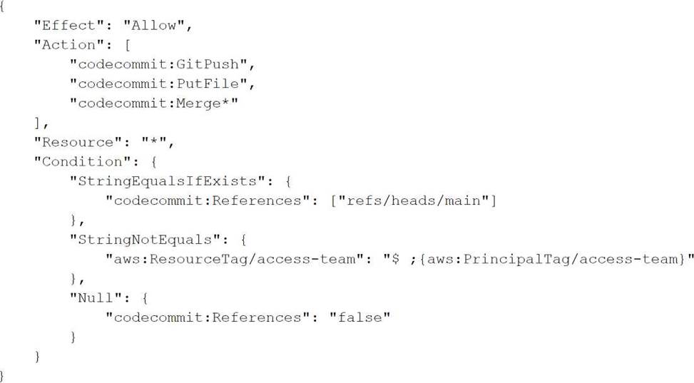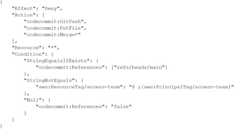 Option E: Attach a Service Control Policy (SCP) to the accounts. The SCP should include a statement like the one provided in the images uploaded, which denies actions such as GitPush, PutFile, and Merge* unless the condition that matches the access-team tag with the session tag is met. This policy prevents users from modifying the main branch unless their access-team tag matches the repository’s access-team tag.