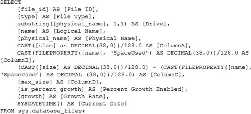size/128.0 – CAST(FILEPROPERTY(name, ‘SpaceUsed’) AS INT)/128.0 AS FreeSpaceMB