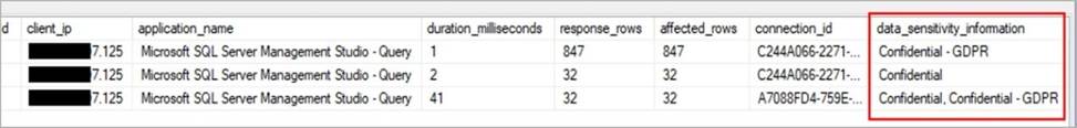 A: An important aspect of the information-protection paradigm is the ability to monitor access to sensitive data. Azure SQL Auditing has been enhanced to include a new field in the audit log called data_sensitivity_information. This field logs the sensitivity classifications (labels) of the data that was returned by a query. Here’s an example:
