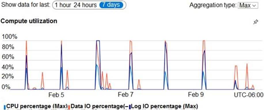 During prototyping of the PaaS solution in Azure, you record the compute utilization of a customer’s Azure SQL database as shown in the following exhibit.