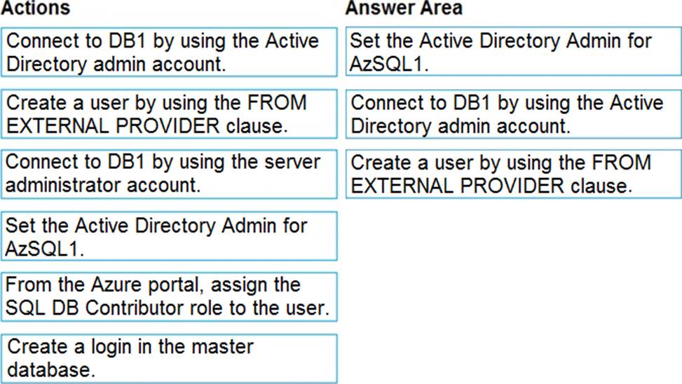 You need to create a contained database user in DB1 who will use Azure Active Directory (Azure AD) for authentication.