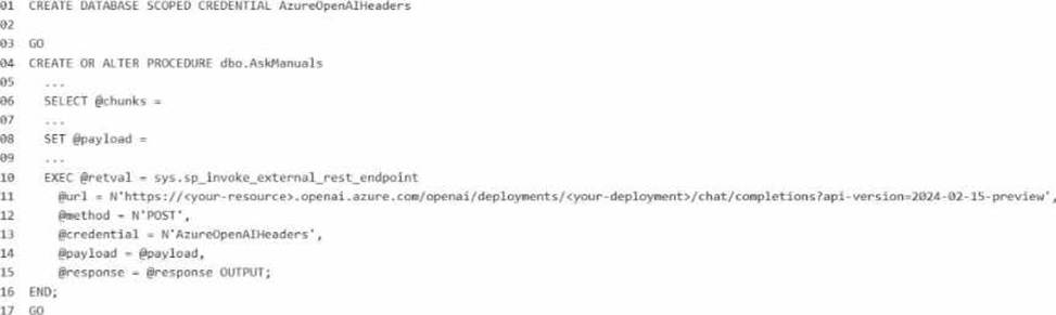 The correct answer is Option B because the requirement is to call an Azure OpenAI REST endpoint from SQL Server 2025 while providing the highest level of security, and the instance already has a managed identity enabled. For Microsoft’s SQL AI features, the preferred secure pattern is to use a database scoped credential with IDENTITY = ‘Managed Identity’ instead of storing an API key. Microsoft documents that SQL Server 2025 supports managed identity for external AI endpoints, and for Azure OpenAI the credential secret uses the Cognitive Services resource identifier: {"resourceid":"https://cognitiveservices.azure.com"}.