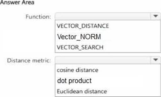 The correct distance metric is cosine distance. Microsoft documents that VECTOR_SEARCH supports cosine, dot, and euclidean metrics, and Microsoft guidance specifically notes that cosine similarity is commonly used for text embeddings. It also states that retrieval of the most similar texts to a given text typically functions better with cosine similarity, and that Azure OpenAI embeddings rely on cosine similarity to compute similarity between a query and documents. Since both NotesEmbeddings and DescriptionEmbeddings are text-derived embeddings and the goal is to minimize the impact of different chunk sizes, cosine is the best choice because it compares direction/angle rather than being as sensitive to vector magnitude as Euclidean distance.