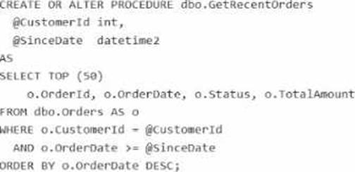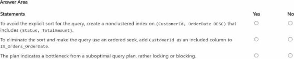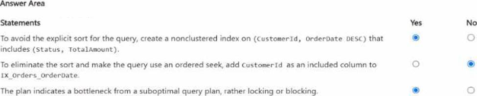 The first statement is Yes. The query filters on CustomerId, applies a range predicate on OrderDate, and sorts by OrderDate DESC. Microsoft’s index design guidance recommends putting equality predicates first in the key, followed by columns used for ordering/range access, because the order of key columns determines seek and sort support. A nonclustered index on (CustomerId, OrderDate DESC) can support an ordered seek for this query and avoid the explicit sort. Including Status and TotalAmount helps cover the query, and OrderId is already available because the clustered key is stored with nonclustered index rows.