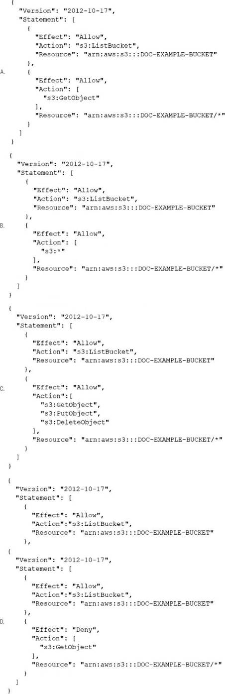 A company has an online web application that includes a product catalog. The catalog is stored in an Amazon S3 bucket that is named DOC-EXAMPLE-BUCKET. The application must be able to list the objects in the S3 bucket and must be able to download objects through an 1AM policy.