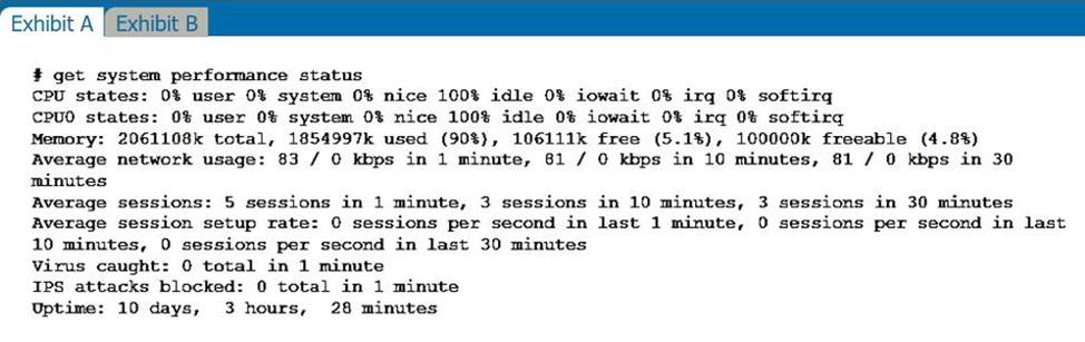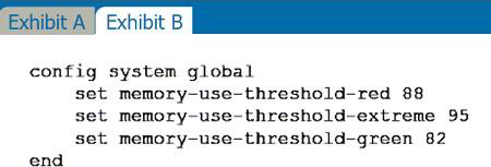 Exhibit B shows a FortiGate configured with the default configuration of high memory usage thresholds.