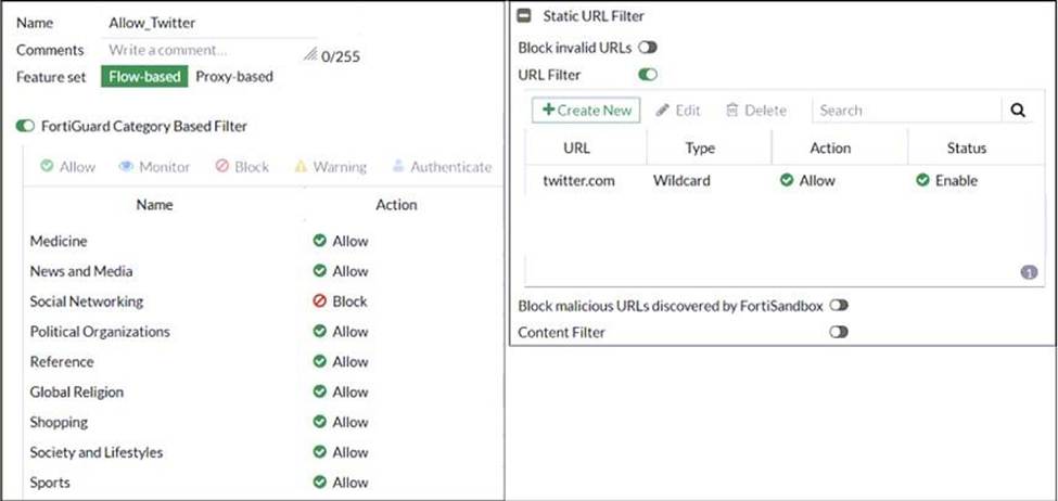 On the Static URL Filter configuration, set Action to Exempt: By setting the Action to Exempt, the administrator can override the block on twitter.com that was specified in the FortiGuard Category Based Filter. This will allow users to access twitter.com, while all other social networking sites will still be blocked.