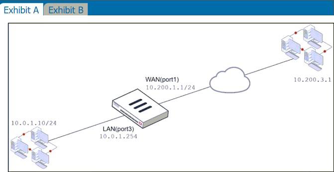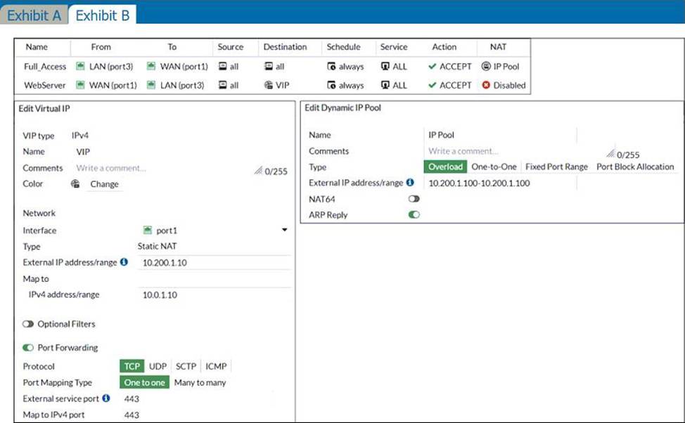 The exhibits contain a network diagram, and virtual IP, IP pool, and firewall policies configuration information.