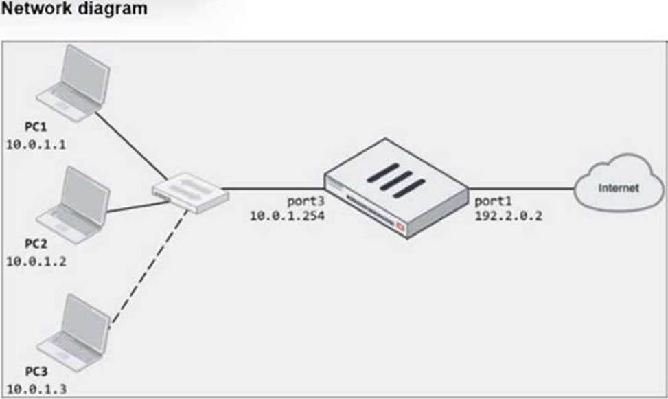 Two PCs, PC1 and PC2, are connected behind FortiGate and can access the internet successfully. However, when the administrator adds a third PC to the network (PC3), the PC cannot connect to the internet.