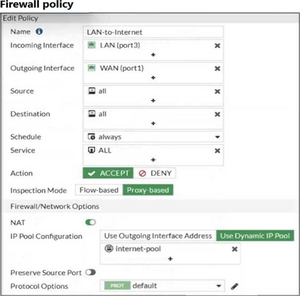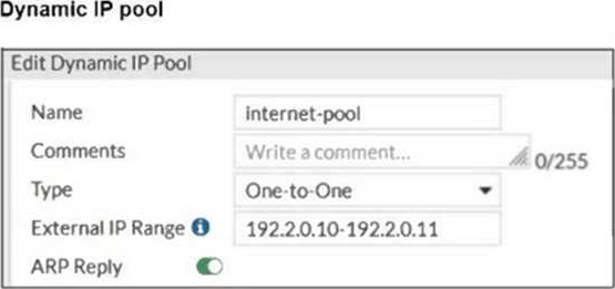 The exhibits show a diagram of a FortiGate device connected to the network, as well as the firewall policy and IP pool configuration on the FortiGate device.